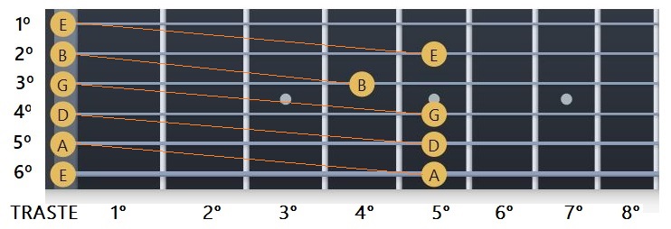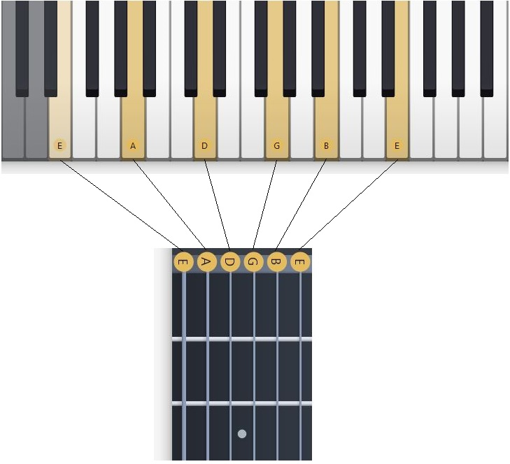Ahora veremos la relación de la guitarra con el piano en cuanto a la afinación de las cuerdas. De este modo lo que veremos en nuestra guitarra es que cada cuerda es un piano que comienza con diferente afinación.