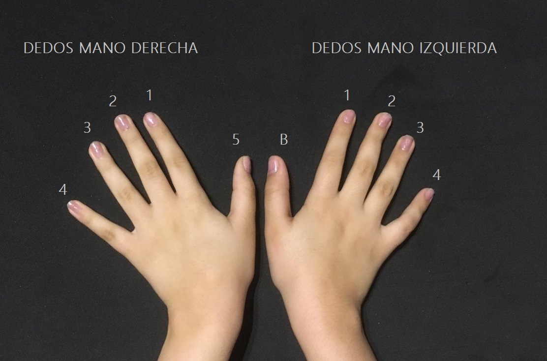 La mano izquierda y la derecha tienen la misma numeración con excepción del dedo pulgar de la derecha que tiene una “B” que significa Bajo.