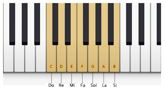 La mejor forma de ver las notas que conforman la escala musical es en un piano, son las notas naturales que están representadas en las teclas blancas de este instrumento. La escala musical que conocemos es Do, Re, Mi, Fa, Sol, La y Si. sin embargo para este curso y por motivo del uso del software Guitar Pro, usaremos la notación anglosajona que remplazó los monosílabos por las primeras siete letras del abecedario. Aquí veremos como queda entonces nuestra notación musical.